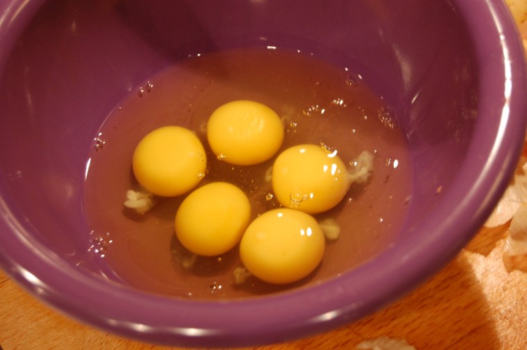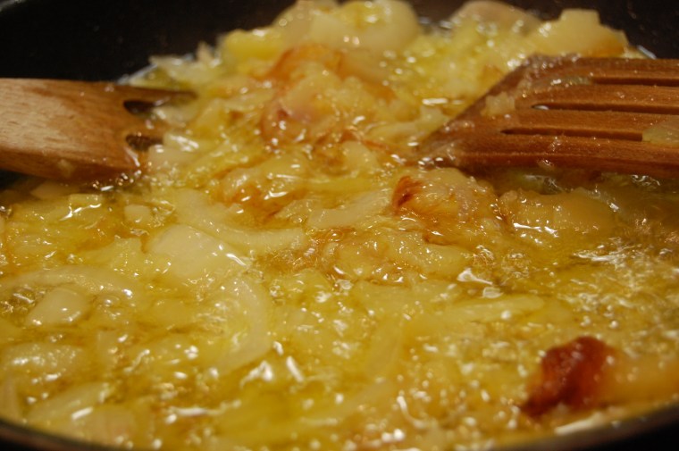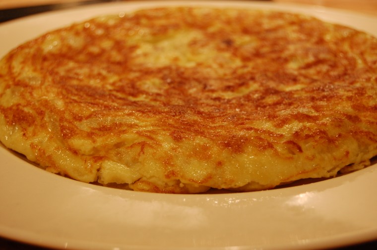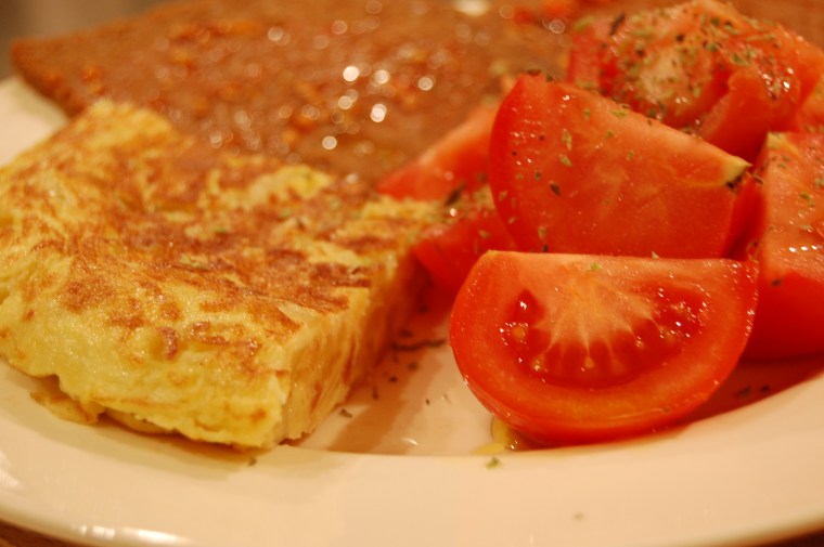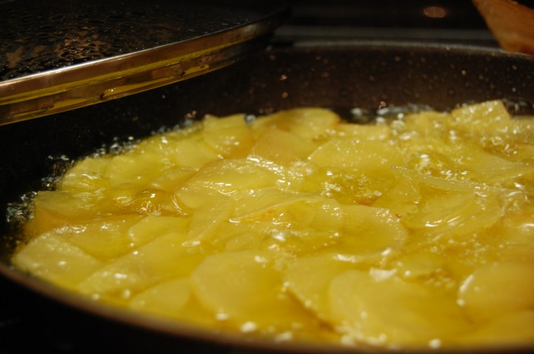 Poco más que decir sobre la tortilla. Yo utilicé 5 patatas «Caporal» variedad «Ágata». Sinceramente, las compré en el pedido mensual del super. La cebolla, es cebolla dulce de Figueres. Los huevos eran de granja, aunque no tenían tan buena pinta como los de la receta original. Luego es seguir las instrucciones… Mi único toque personal, y lo leí no sé donde, es que para que la tortilla quede siempre bien esponjosa, hay que batir los huevos con fuerza e intensidad hasta que quede una mezcla espumosa.