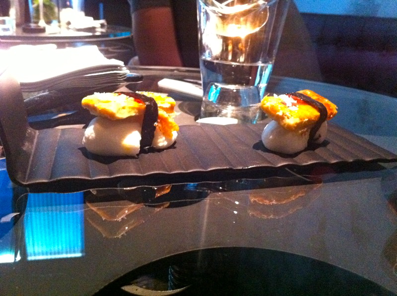 Empezamos con un niguiri de Foie. Pero como no, el Foie está caramelizado, en lugar de alga, lo que casa el arroz (que tampoco es arroz) y el veneno es una cinta hecha de haba tonka.