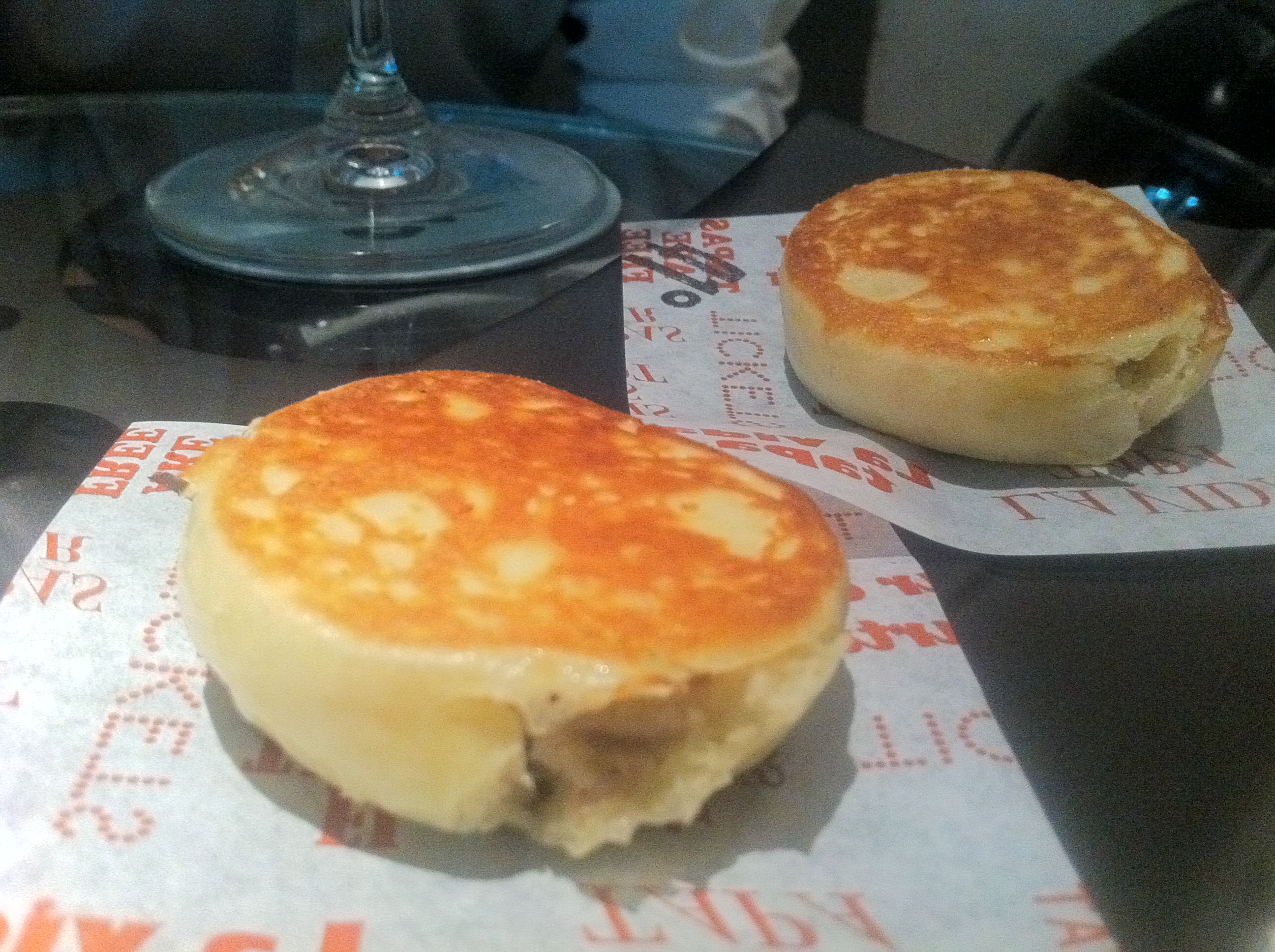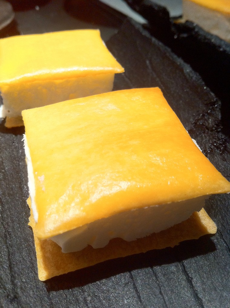 Un brioche planchado relleno de queso trufado del que no querrías que se acabara nunca su infinita cremosidad de la mano de un genial queso trufado. Jamás he visto nada tan bien casado.