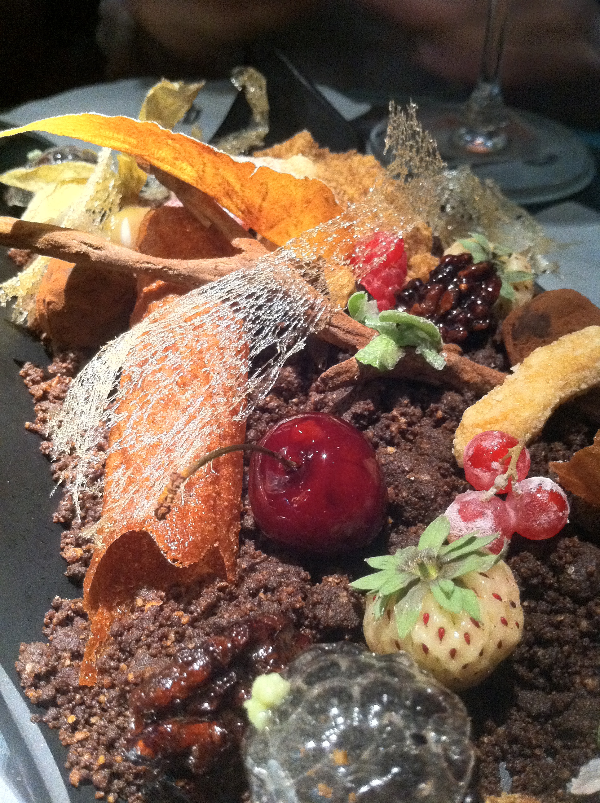 Y para concluir, los dulces. Bombas de chocolate. Triviales comparadas con el último. El colofón. Un paseo por el bosque del dulce. Lo único que no se come es el plato y poco más… cerezas caramelizadas envueltas de gelatina, arena de chocolate, nueces garrapiñadas, ramas de canela y chocolate y mil bocados que quedan grabados en la memora para casi siempre.