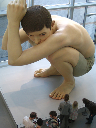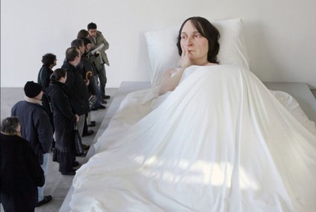Para terminar con los tres mini post, no podía faltar Ron Mueck, un escultor hiperrealista australiano que vive en Inglaterra. Este artista que empezó en el mundo del cine aparentemente en películas tan míticas como Laberinto, se trasladó más tarde a Londres para establecer su propia compañía, creando “animatronics” para la industria de la publicidad. A pesar de ser altamente detallados sus trabajos, eran diseñados para ser fotografiados desde un ángulo muy específico, ocultando así el desorden de la obra vista desde otro ángulo.